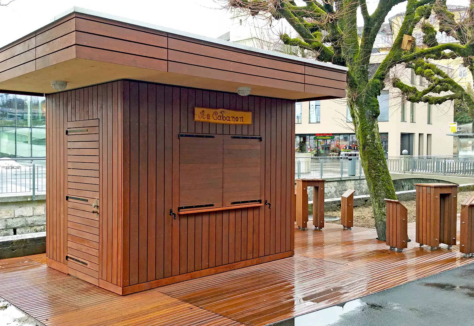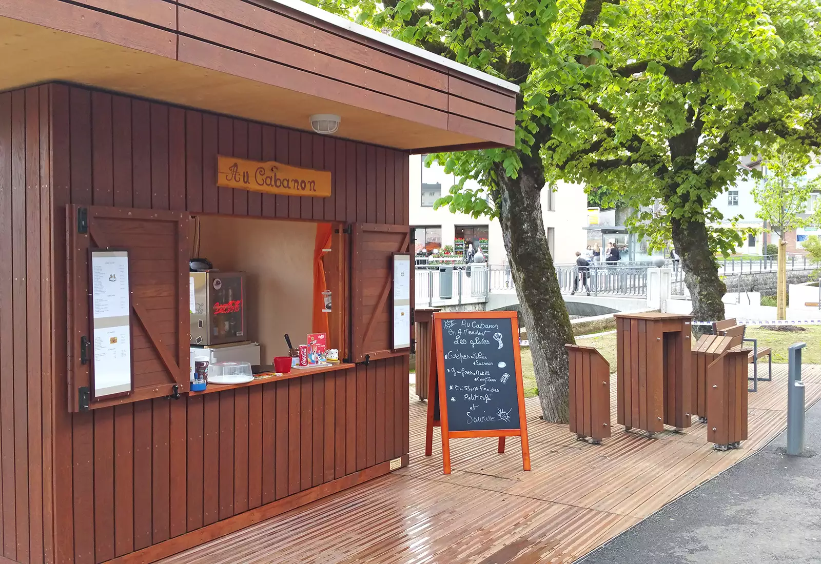 Cabane à crêpe ossature bois, deck de terrasse en chêne imprégnés aux sels CCO + huilé, ainsi que du mobilier en chêne huilé fabriqué sur mesure.