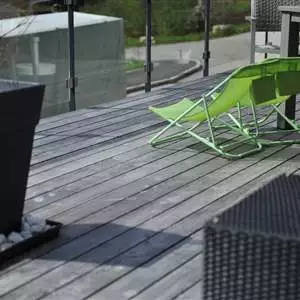 Nous avons fourni des lames de terrasse en mélèze suisse, avec une finition ECOGRIS®, bois pré-grisaillé.
