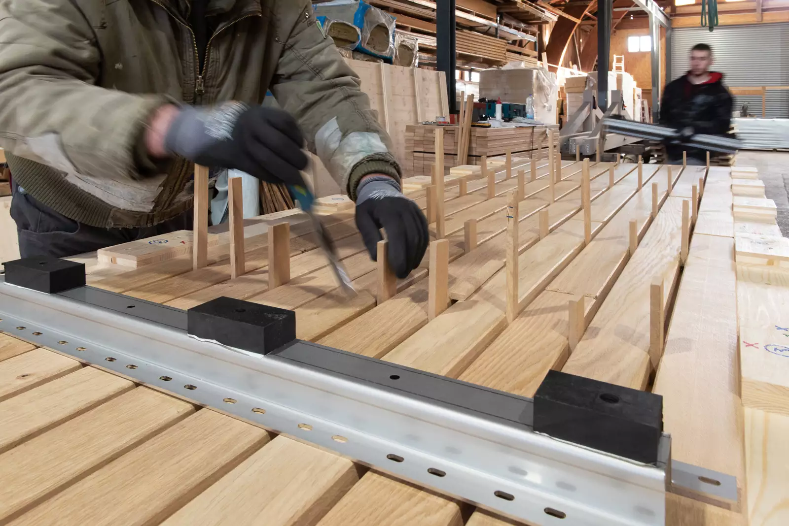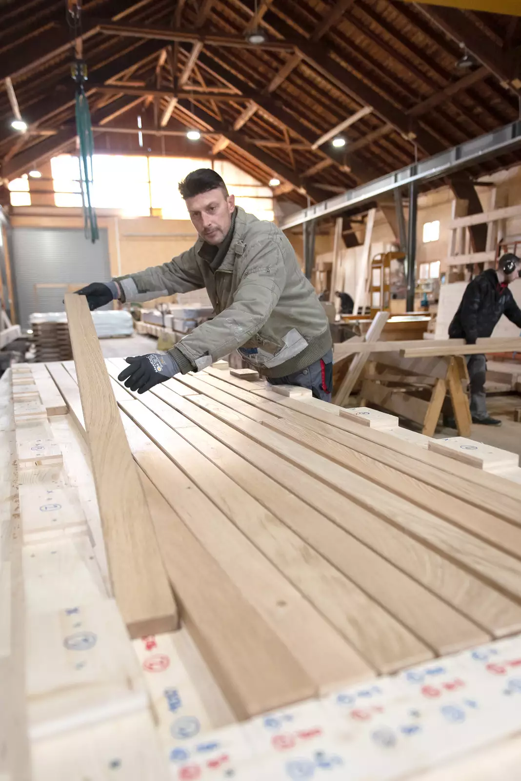 Le Groupe Corbat s'est engagé avec enthousiasme dans ce projet. Conseils et accompagnement pour garantir l'utilisation de l'essence indigène la plus appropriée pour ce projet : le chêne. Partenariat exclusif avec Forêt Genève pour assurer au maître de l'ouvrage un chêne de qualité (QF1bis/2) 100% bois suisse avec la mise en place d'une compensation forestière genevoise. Appui technique pour sécuriser les principes constructifs. Mise à disposition de notre bureau technique pour réaliser tous les plans de fabrication : sous-construction métal, systèmes constructifs et habillages chêne. Préparation des lames de bois sur notre ligne de sciage de Vendlincourt avant les finitions sur le site de Glovelier. Assemblage dans nos ateliers des 227 pièces du puzzle qui composent "l'anneau". Préparations techniques et calculs avec l'entreprise de pose (Gaidon) pour assurer un assemblage précis et fiable sur le terrain.