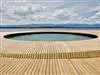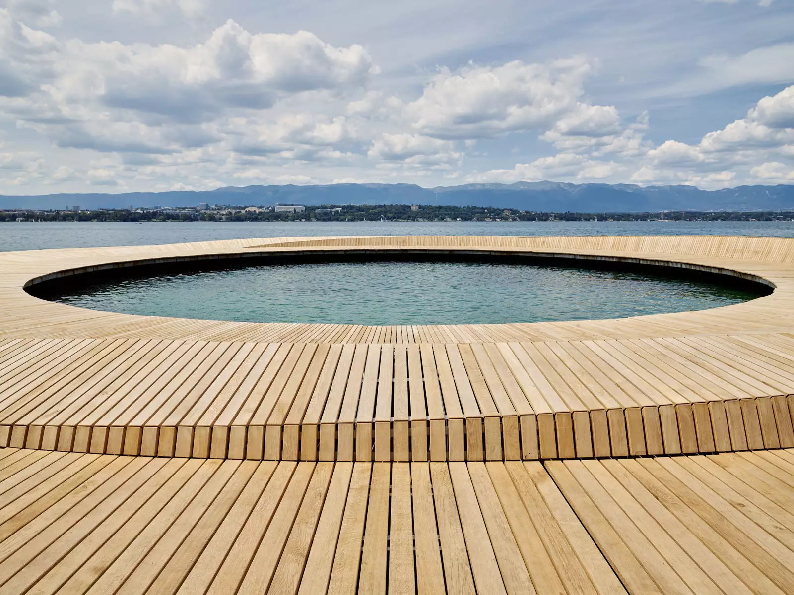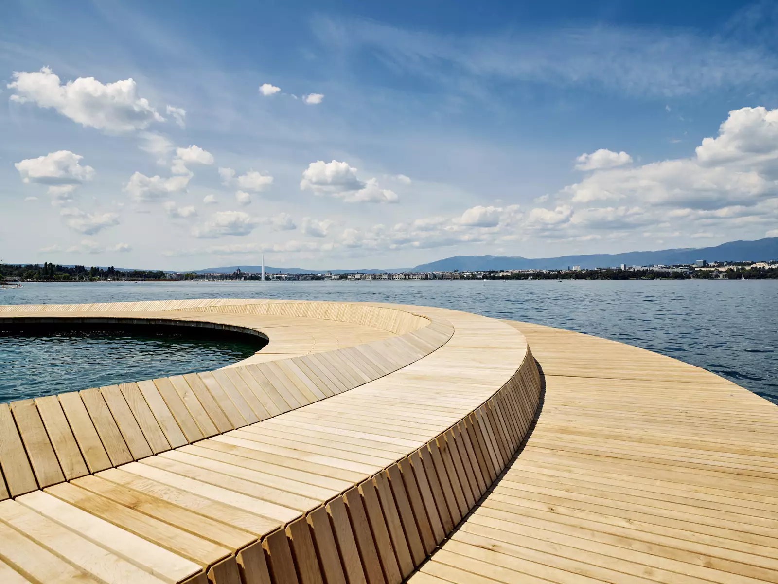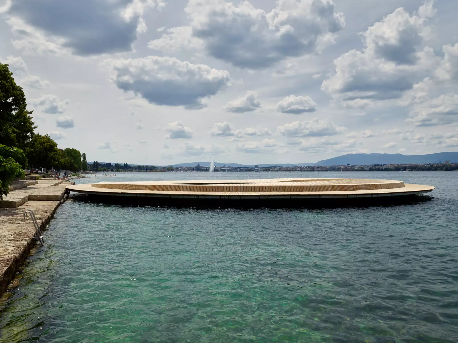 Aujourd’hui les baigneurs peuvent profiter d’un ponton flottant de 40 mètres de diamètre constitué de deux anneaux entre lesquels s’insère un banc courbe en forme de vague. Avec en prime, un point de vue unique sur la rade et le jet d’eau de Genève. L’objet représente une surface de 900 m², il est composé de 227 pièces pré-assemblées dans nos ateliers et 5'000 lames de bois.