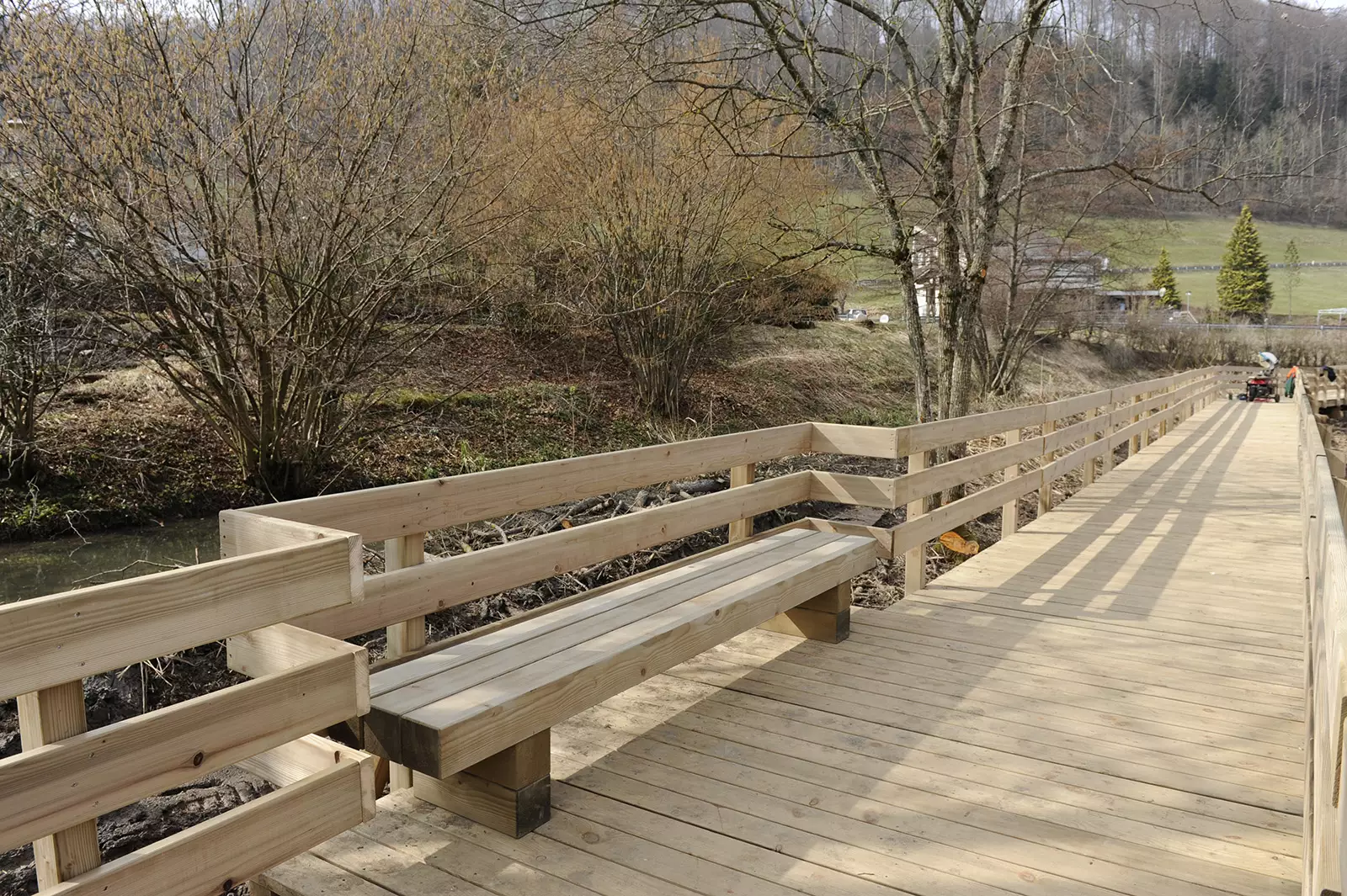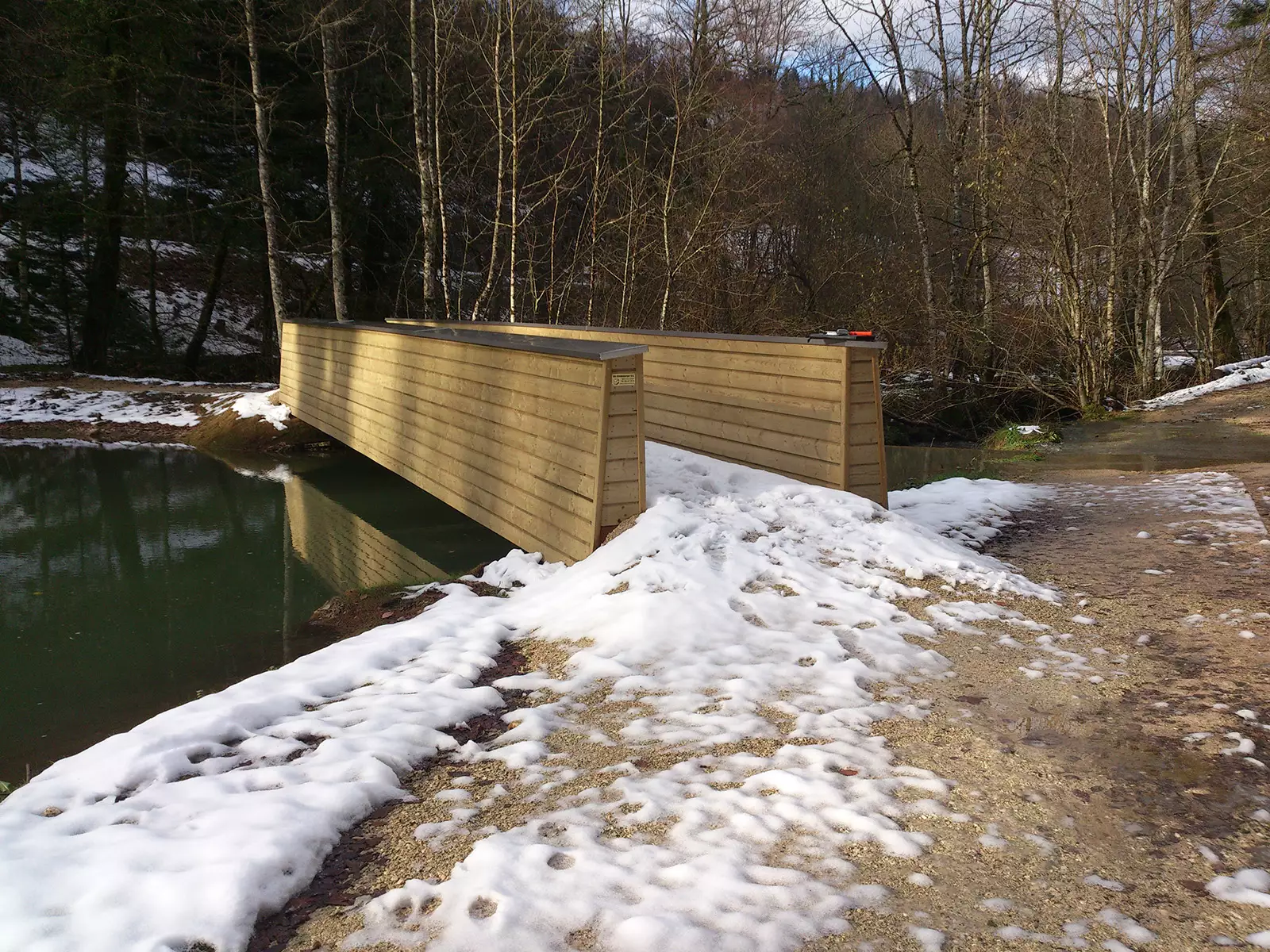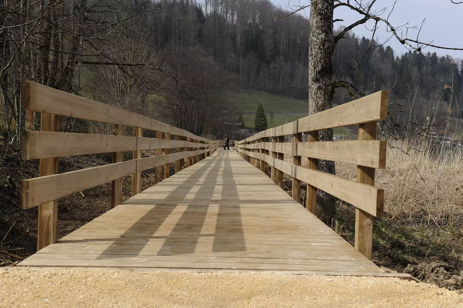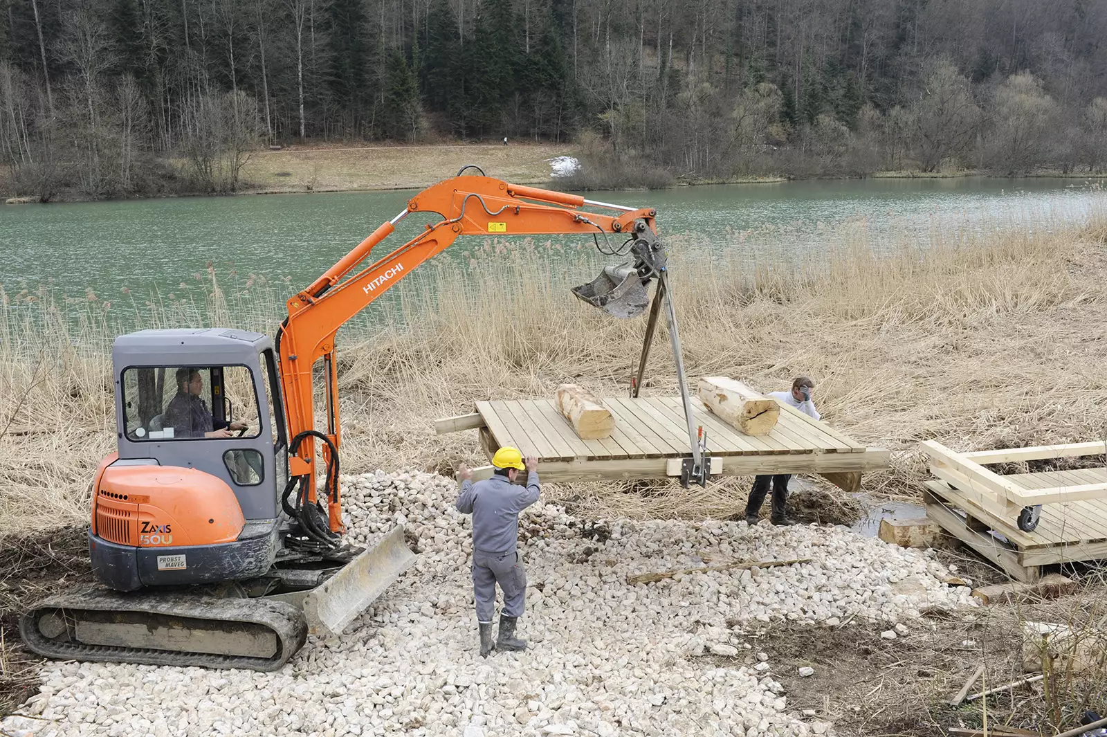 Afin de permettre aux promeneurs de goûter à ce lieu de quiétude autour du Lac, la fondation a eu l’idée de poser une passerelle en bois de la région. Ets Roethlisberger (depuis 2020 Groupe Corbat Glovelier) a été sélectionné pour ce projet particulier.