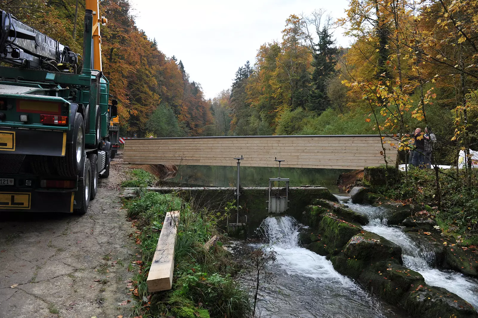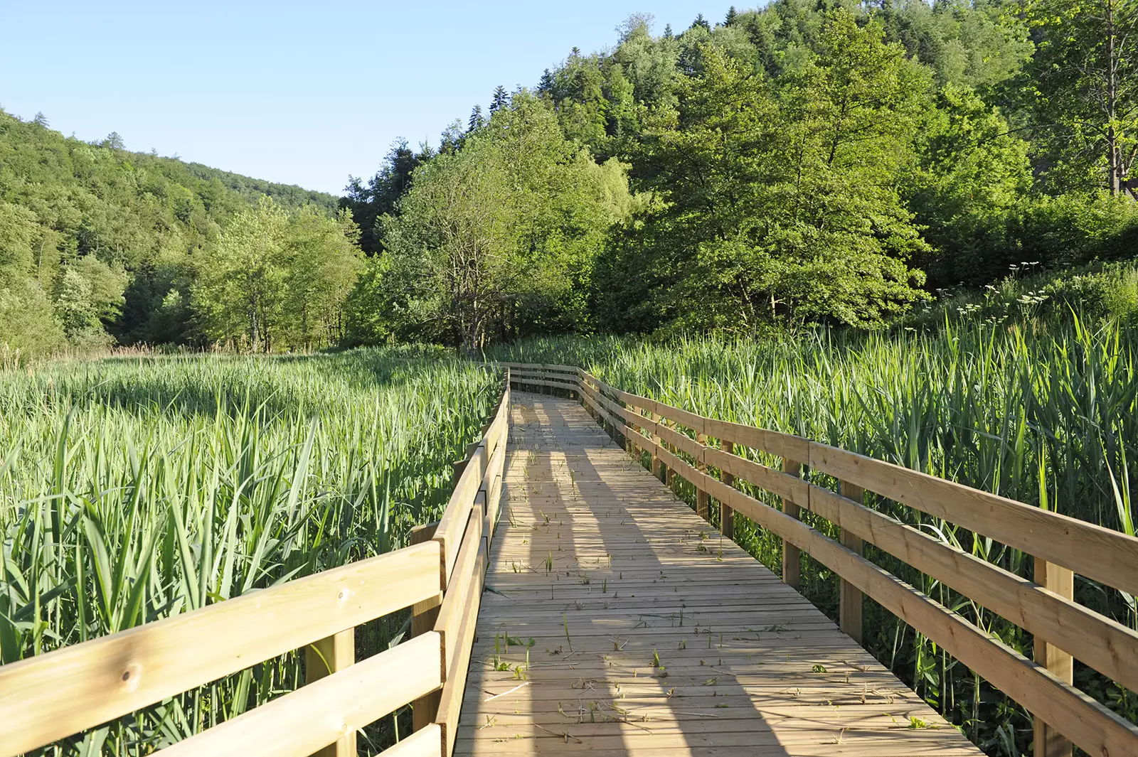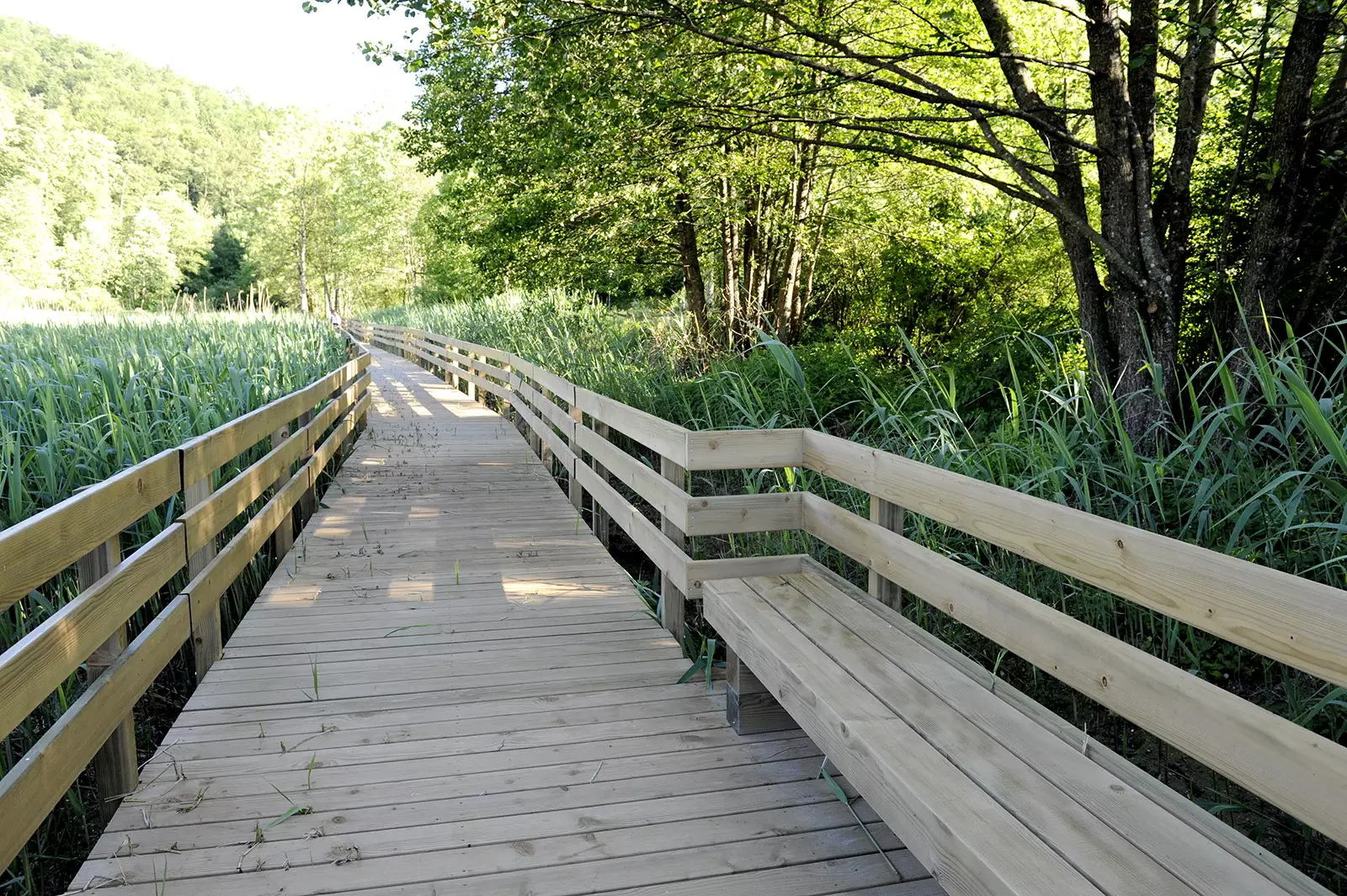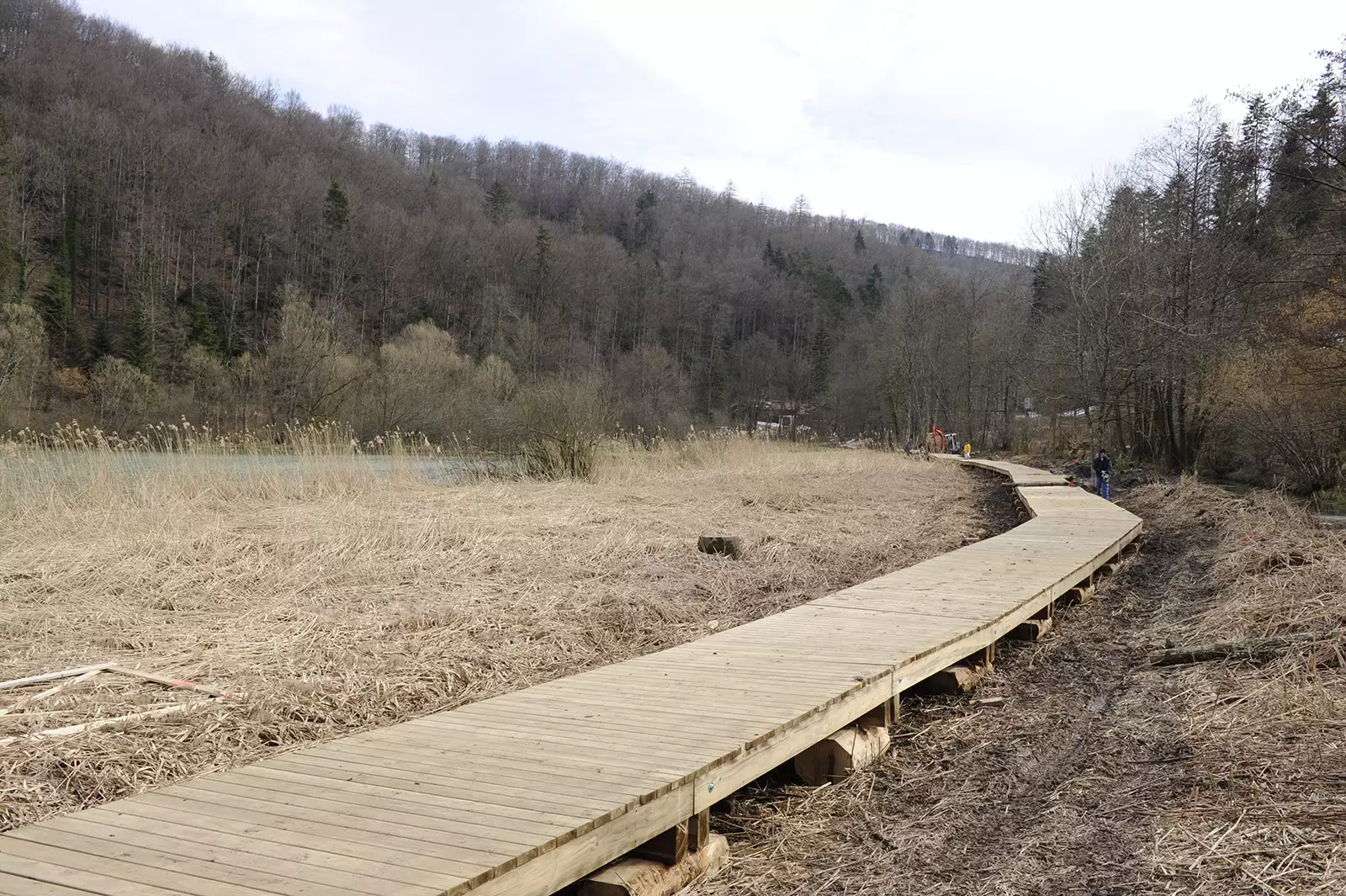 Afin de permettre aux promeneurs de goûter à ce lieu de quiétude autour du Lac, la fondation a eu l’idée de poser une passerelle en bois de la région. Ets Roethlisberger (depuis 2020 Groupe Corbat Glovelier) a été sélectionné pour ce projet particulier.