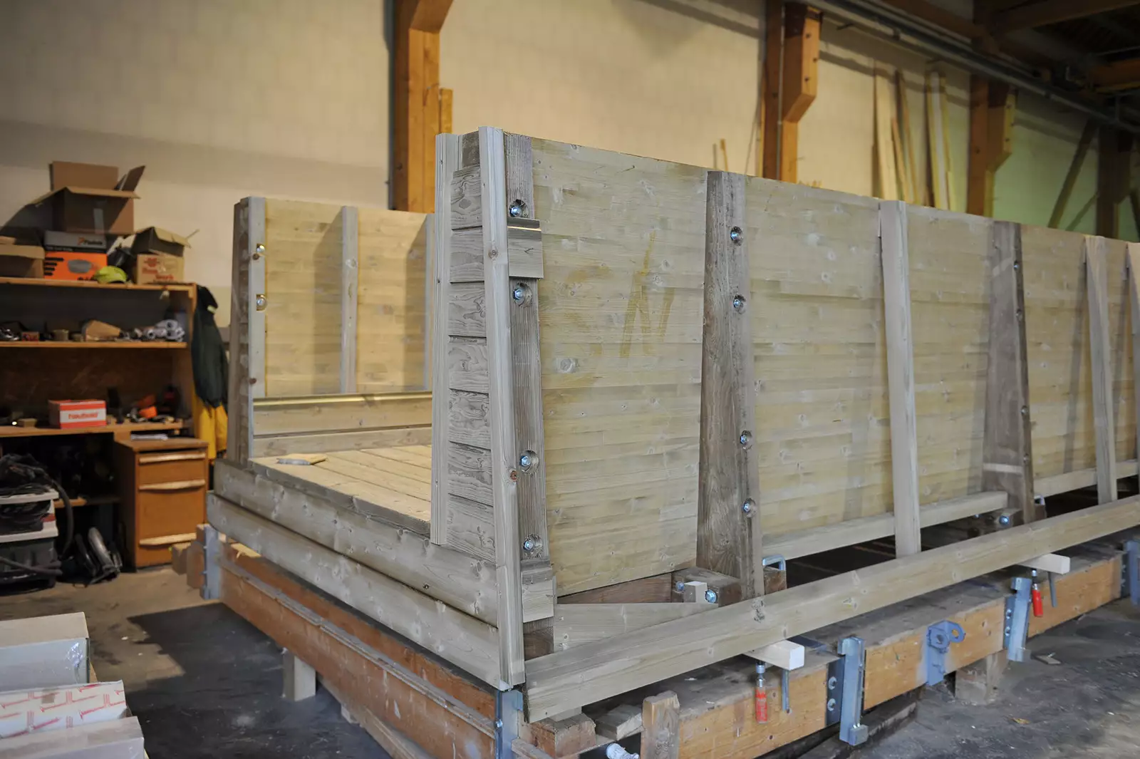 La structure est composée de 50 modules de 3,5 m de long et de deux modules plus larges recevant des bancs. Les modules ont été entièrement montés et assemblés dans notre atelier.